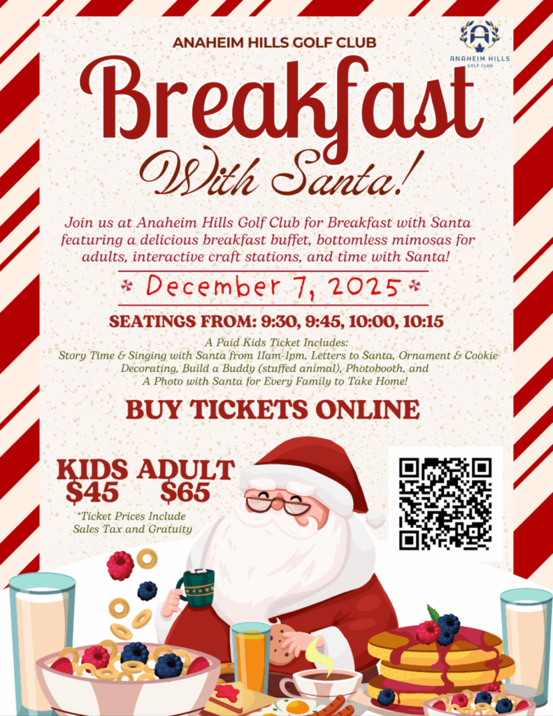 Whether you are planning a shower, birthday party, mitzvah, quinceañera, anniversary, celebration of life, prom, rehearsal dinner, retirement, reunion, holiday party, engagement or graduation celebration, the Anaheim Hills Golf Club Clubhouse does it all! Come celebrate your special occasion in style. Host your event overlooking the golf course with twinkling lights on the hilltops. Customizable menus and packages allow for easy, stress-free planning while organizing your event. Our staff is ready to guide you through your preparation and help your bring your vision to life!